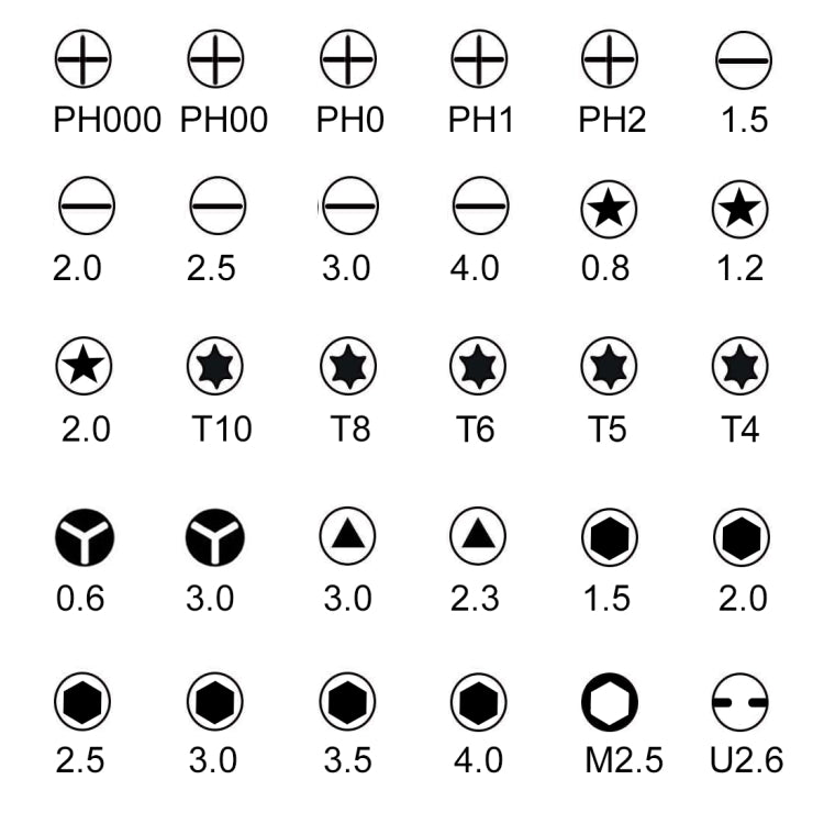6. Spécifications de la tête de coupe: T9, T10, T8, T20, T7, T6, T5, T15, 3,5 mm, 2,5 mm, 4 mm, 2 mm, 1,0 mm, PH0 #, PH00 #, PH000 #, PH1 #, PH2 #